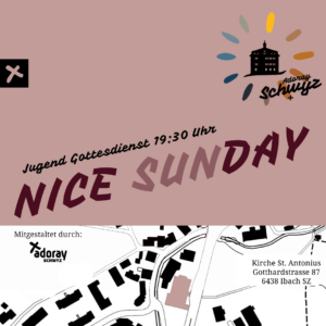 Monatlich gestalten wir den Nice Sunday Gottesdienst in Ibach. In Adoray+ Gruppen tauschen wir uns nach einem leckeren Nachtessen über den Glauben aus. Aktivitäten wie Vollmondwanderungen, Schneetage, Schnitzeljagden und Filmabende tragen zur guten Gemeinschaft bei.